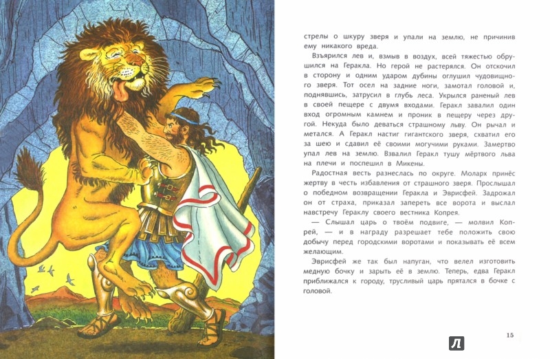 Острые когти льва были использованы для стрижки его несокрушимого меха, и Геракл носил его на голове в качестве доспехов в будущих битвах.»