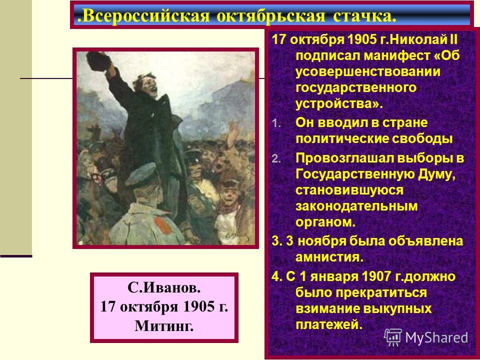 В этот момент существовала реальная опасность превращения всероссийской забастовки во всеобщее вооруженное восстание и как следствие свержение царской власти. В этой ситуации Николай II был вынужден пойти на уступки протестующим. 17 октября 1905 года он подписал Манифест «Об усовершенствовании государственного порядка», в редакции С.Ю. Витте, изменивший основы государственного строя Российской империи.