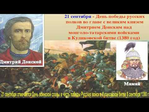 21 сентября – День победы русских полков во главе с Великим князем Дмитрием Донским над монголо-татарскими войсками в Куликовской битве.