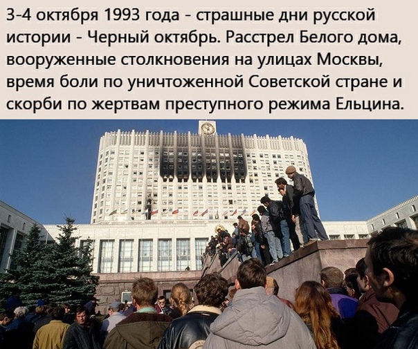 – И вся страна увидела на телеэкранах страшное зрелище, как танки стреляют по зданию, огромный Белый Дом покрывается копотью, и из него вырываются языки пламени. Всего выпущено было 12 снарядов.