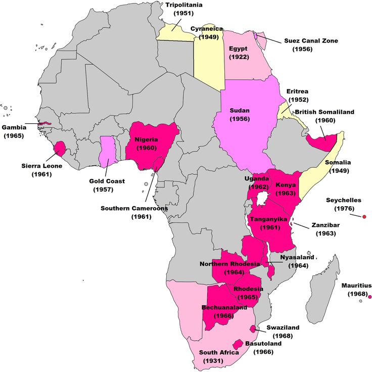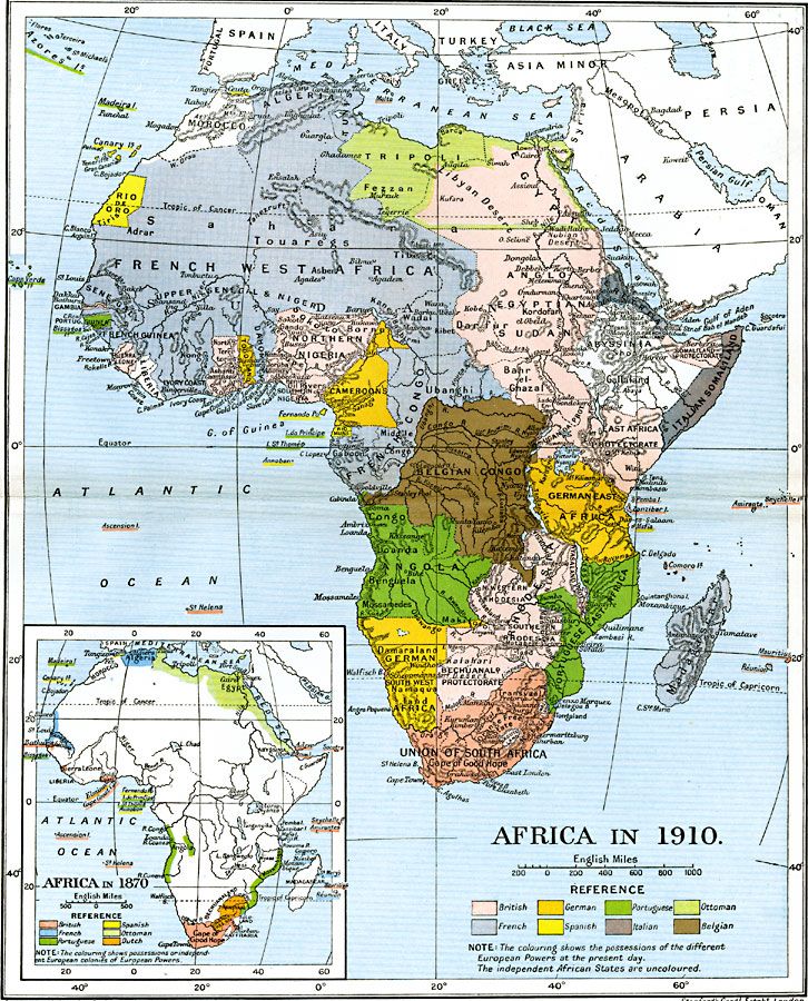 К началу XX в. официальную независимость в Африке сохраняли лишь Эфиопия, Либерия, созданная Американским колониальным обществом для расселения освобожденных рабов, и Марроко, которое, однако, вскоре было разделено между Парижем и Мадридом. Практически вся территория континента (более 90%) находилась под колониальным правлением Великобритании, Франции, Португалии, Германии, Бельгии. Италии и Испании. Египет де-юре был частью Османской империи, но реально находился под британским контролем.