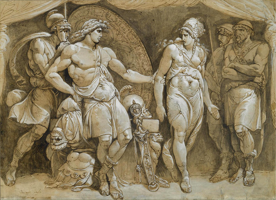 На картине итальянского художника Джованни Баттисты Тьеполо посланники Агамемнона Талфибий и Еврибат выводят Брисеиду из шатров Ахилла. Спиной к зрителю стоит Ахилл. Еще минута — и он расстанется со своей любимой пленницейИх в своем сердце он понял и к посланным так обратился: