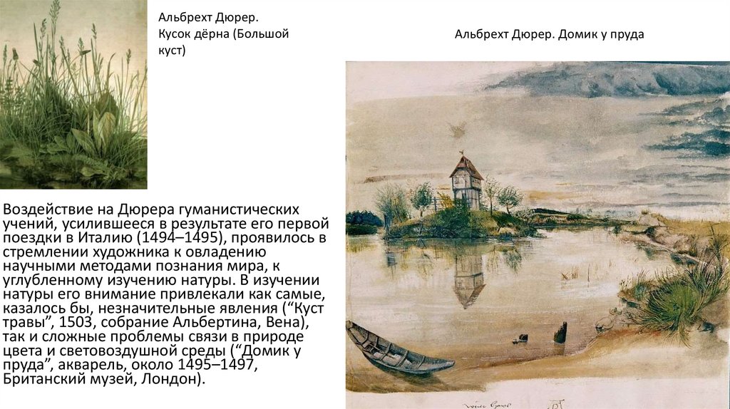 С 15 века фламандская живопись или кельнская живопись проявляли заметный интерес к изображению живого и реального, и Дюрер сделал его вездесущим главным героем своих изображений. Он был отмечен очень рано пейзажами, с которыми он столкнулся во время своих путешествий в Альпах или вокруг Нюрнберга.