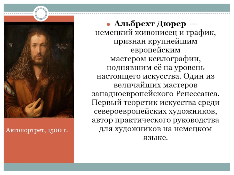 Дюрер был не только великим художником и выдающимся представителем немецкого гуманизма. Он много времени уделял научным исследованиям и работам в области теории искусства, занимался изучением пропорций человеческого тела. Свой первый собственный автопортрет Дюрер написал в 13-летнем возрасте свинцовым карандашом.