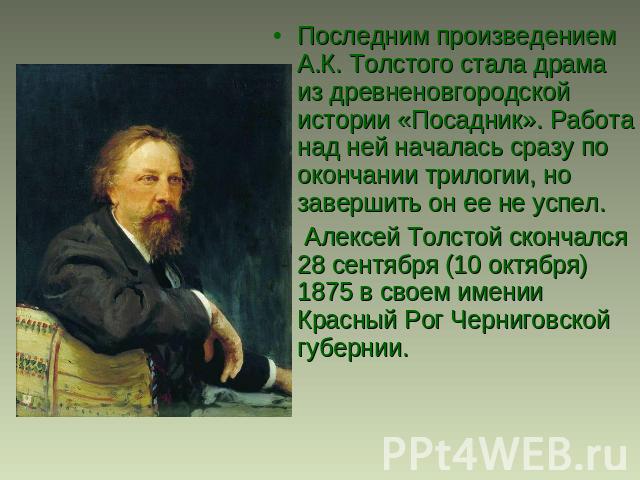 Затем он начал писать первую часть драматической трилогии — «Смерть Иоанна Грозного». Это произведение шло на театральной сцене и пользовалось необычайным успехом. Кроме многочисленных чисто литературных достоинств оно ценно еще и тем, что в свое время явилось первой попыткой вывести реальный образ царя, царя-человека, живую личность, а не возвышенный портрет одного из великих мира сего.