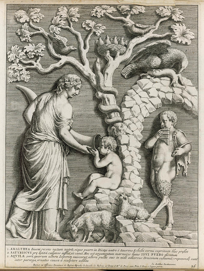 «[Куреты] унесли [младенца] Зевса в пещеру и передали нимфам, велев им всячески заботиться о младенце. Нимфы вскормили дитя смесью из меда и молока, а кроме того подносили его питаться к вымени козы Амалфеи…. Вскормившей его козе (αιξ) Зевс оказал
