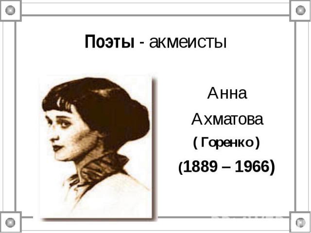 Ахматова-Гумилева-Шилейко (урожденная Горенко) Анна Андреевна ― поэтесса-акмеистка Серебряного века, литературовед и переводчица, почетный доктор Оксфордского университета (Великобритания), дважды номинировалась на Нобелевскую премию по литературе.