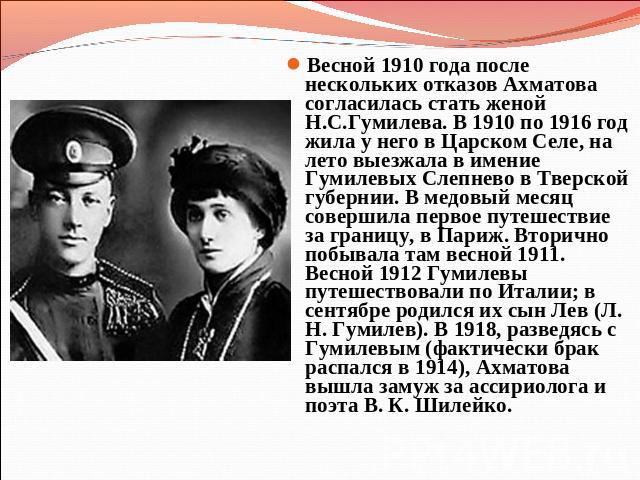 Далее, в 1918 г., сразу после расставания с Гумилевым, она вышла замуж за известного ученого В. Шилейко. Это был поистине потрясающий ученый, знавший более 50 языков.