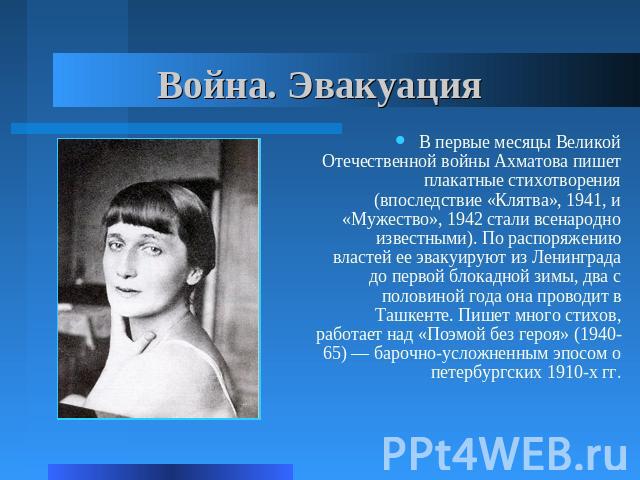 В первую мировую войну Ахматова полностью ограничила свою публичную жизнь. Однако это было несравнимо с тем, что произошло потом в ее непростой биографии. Ведь впереди ее еще ждала Великая Отечественная Война – самая кровавая в истории человечества.
