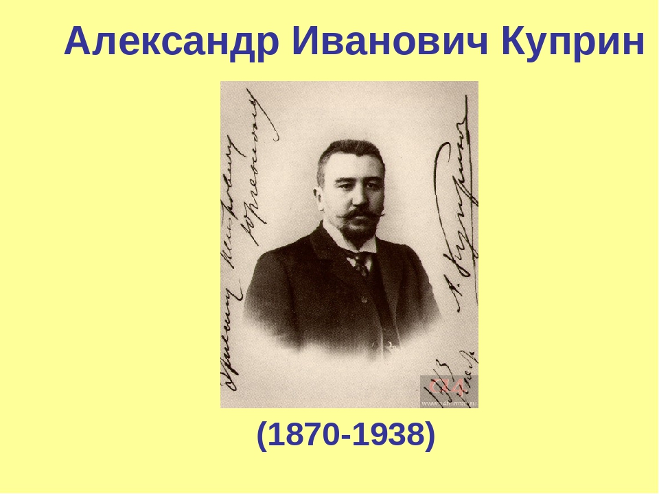 Александр Куприн русский писательАлександр Иванович Куприн (7 сентября 1870 — 25 августа 1938) — русский писатель, наиболее известный своими романами «Дуэль» и «Яма», а также «Изумруд» и «Гранат». Браслет — по последнему снят фильм 1965 года.
