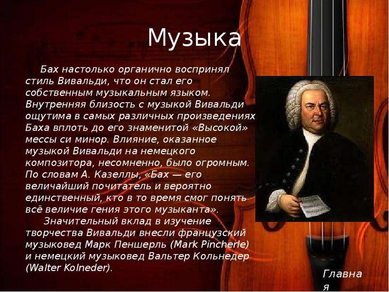 Велико художественное значение произведений Баха для оркестровых инструментов, среди которых особое место занимает скрипка. Выдающиеся скрипачи-концертанты нашего времени покоряют сердца слушателей знаменитой «Чаконой».