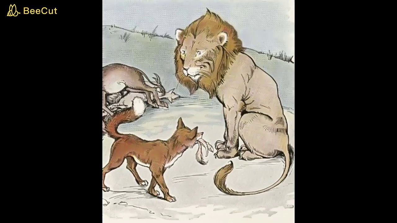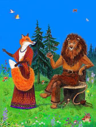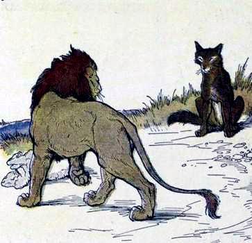 Жил-был Лев, а потом постарел и не мог больше охотиться на зверей, как прежде. Но он не отчаялся и решил впредь добывать себе пропитание не силой, а хитростью. Залег в пещере, притворился больным и звал к себе разных зверей (съедобных, разумеется) в гости, чтобы они его проведывали. Животные в пещеру входили и обратно домой уже не возвращались. Однажды на огонек ко Льву заглянула Лисица, но она оказалась умнее других зверей. Кума волка в русских сказках остановилась у входа в пещеру, где лежал «больной» Лев, когда же он спросил, почему она не проходит в его апартаменты, Лиса ответила так: «Оттого не вхожу, что по следам вижу — входов много, а выходов нет». Такая вот история, а мораль басни «Лев и Лисица» Л. Н. Толстого следует далее. Она рельефнее высвечивается в процессе сравнения с оригиналом Эзопа.
