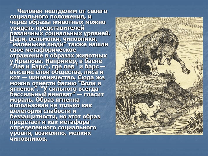 Цари, дворяне, чиновники, «маленькие люди» также нашли свое метафорическое отражение в образах животных у Крылова. Например, в басне «Лев и леопард», где лев и леопард — высшие слои общества, лиса и кошка — чиновники.Сюда же относится басня «Волк и ягненок». «У сильного всегда виноват слабый», — говорит мораль.
