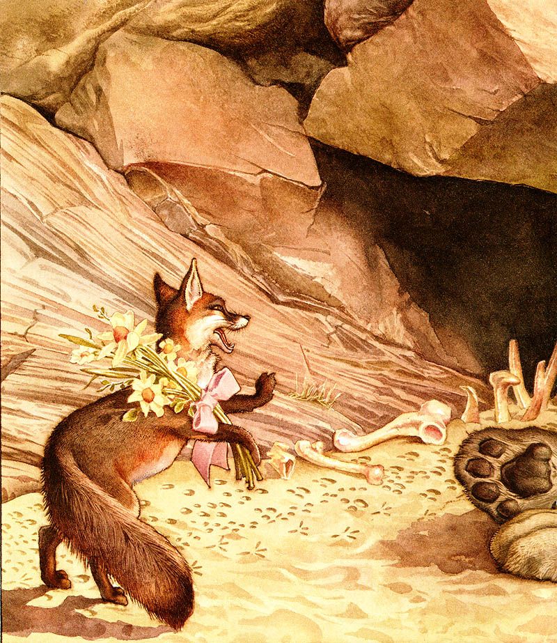 У древнего грека такой же сюжет, но у него последняя фраза Лисы: «И вошла бы, кабы не видела, что в пещеру следов ведет много, а из пещеры — ни одного».
