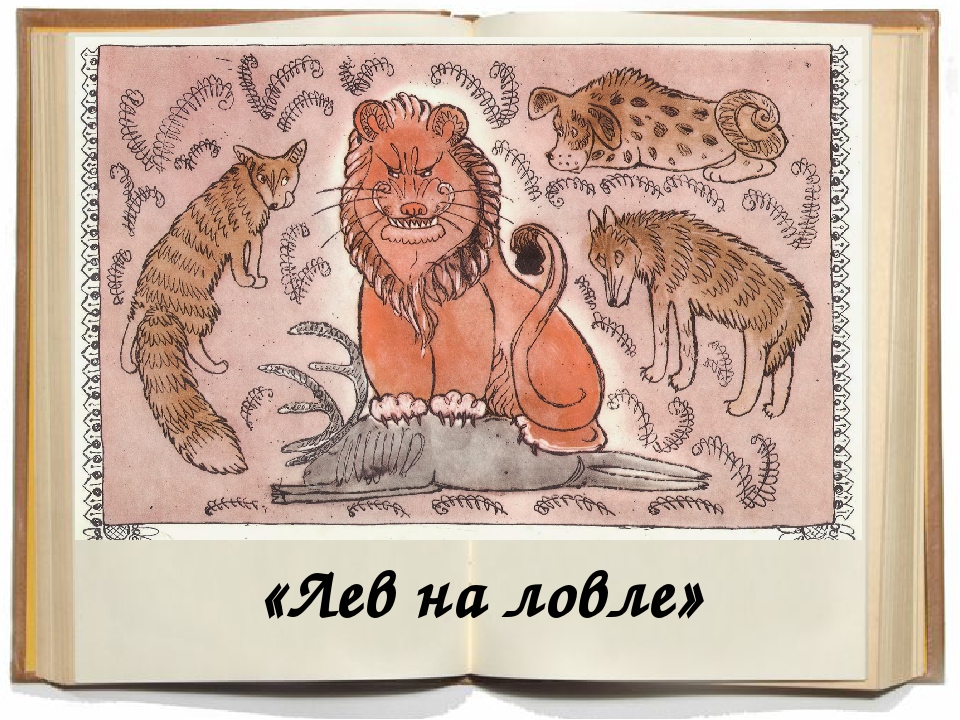 Обратимся к басне 1830 года. Ее название “Лев”. Просто “Лев”, без “и”. Лев, так сказать, в чистом виде. И басни истина дана тоже в чистом виде: к рассказу нет пояснения, нет морали. Одна лишь картина, снятая с действительности. Картина, правда, аллегорическая, но тем она правдивее. Итак, когда Лев стал стар и хил, ему надоела жесткая постель.
