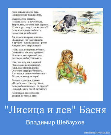 Напоследок интерпретация одного из «героев нашего времени», современного «Шерлока Холмса» от медицины — Доктора Хауса. Если бы ему предложили ответить на вопрос, какова мораль басни «Лев и Лисица» Толстого? Он бы сказал в своем цинично-ироничном стиле: она в том, что люди (и звери) не меняются, и все безостановочно лгут. А значит, Льву верить никак нельзя. Соответственно, Лиса все сделала правильно. И конечно, лучший выдуманный диагност на свете не оставил бы Льва без диагноза и лечения. В финале истории Лев смог бы бегать и убивать зверей как обычно. Таким получилось изложение темы «Мораль басни «Лев и Лисица» своими словами.