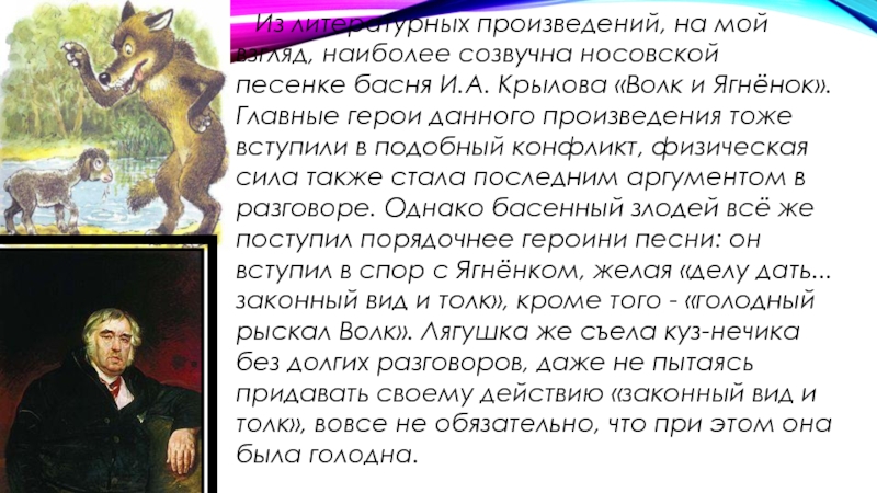 Баснописец вкладывает в рот животным некоторые элементы разговорной речи разных сословий того времени. Крылов — поистине народный, художник большой силы, влияние его на русскую литературу было огромно.