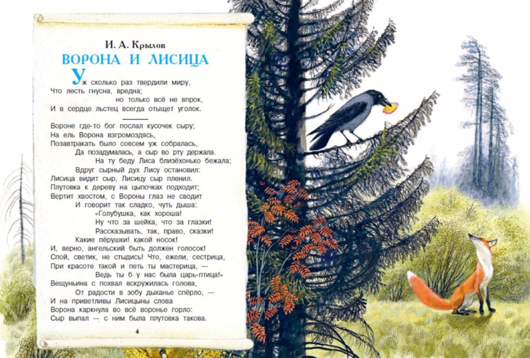 О том, как льстивая Лиса провела Ворону и отняла у нее вкусный сыр, расскажет детям басня «Ворона и Лисица» Крылова.
