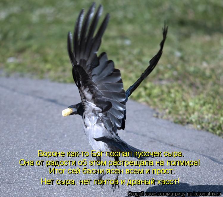 Ворона всего лишь жертва глупого розыгрыша. В последних строчках лиса говорит ей, какой у нее красивый голос, восхваляя таким образом ее красоту. Но стоит только спеть ворону, как сыр попадает в лапы лисы и она остается без вкусного завтрака.