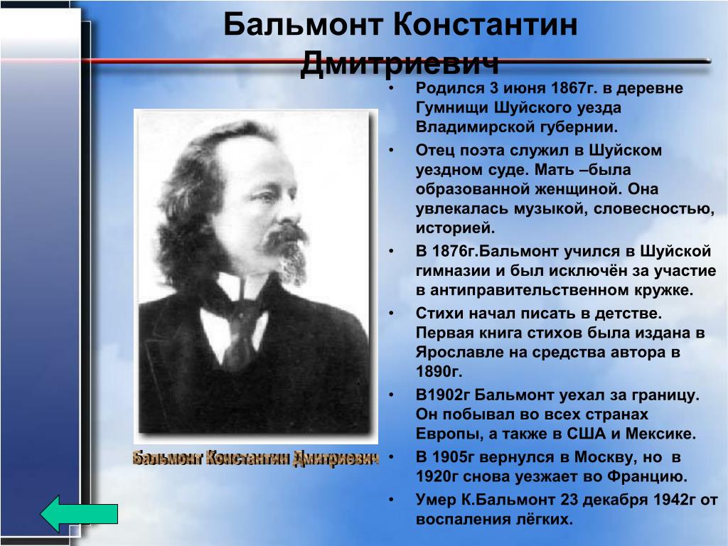 Краткая биография Константина Бальмонта для школьников