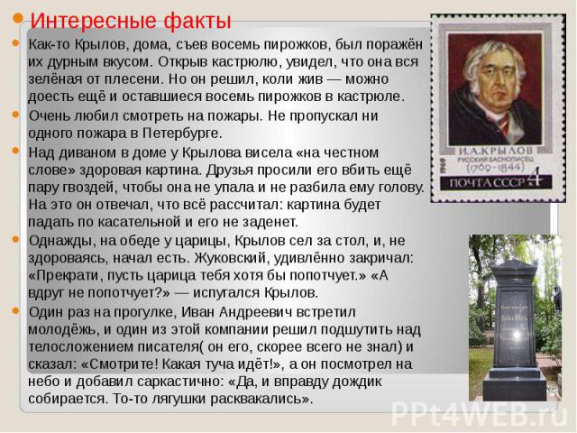 Полностью растворился в лени и гурманстве . Все считали, что Крылов умер от заворота кишок вследствие переедания, а на самом деле — от двухстороннего воспаления лёгких.