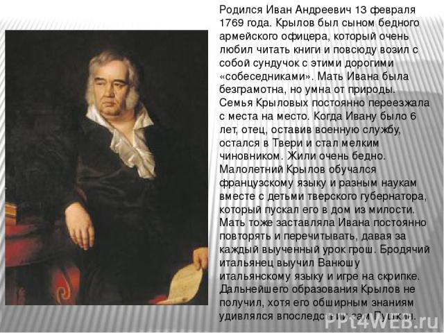 Иван Андреевич Крылов (1769–1844) Иван Андреевич Крылов родился 13 февраля 1769 года в Москве в семье бедного армейского капитана. По долгу службы семья часто меняла место своего жительства; вскоре после рождения сына переехала в Оренбург. А когда отец вышел в отставку, семья