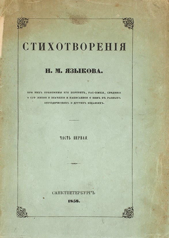 Н. М. Языков родился 16 марта (н.с.) 1803 г. На Волге в Симбирске в состоятельной дворянской семье. Получил хорошее домашнее образование, что позволило ему в возрасте 11 лет начать учиться в Горном кадетском корпусе и затем в Институте корпуса инженеров путей сообщения в Петербурге (1814-1820). В период учебы пишет много стихов. Для продолжения образования едет в Дерпт, где в течение 7 лет учится на философском факультете университета (1822-1829). В совершенстве овладевает немецким языком, приобретает глубокие познания в истории, политэкономики.