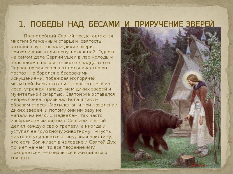 Бесы и сам дьявол пытались соблазнить и устрашить святого, но он не поддался. (Кстати, упоминания о сатанинских кознях и искушениях в житии практически обязательны.) К Сергию стали приходить звери, в том числе достопамятный медведь.