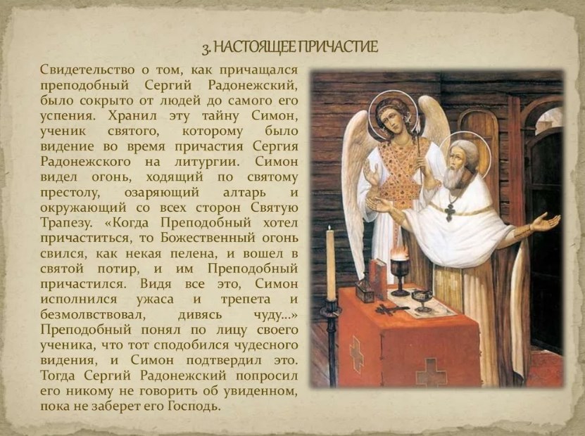 Постепенно монахи стали свидетелями и других подобных действий. Однажды за Литургией со святителем служил Ангел Господень, но преподобный Сергий по смирению своему запретил кому-либо рассказывать об этом до самой смерти.