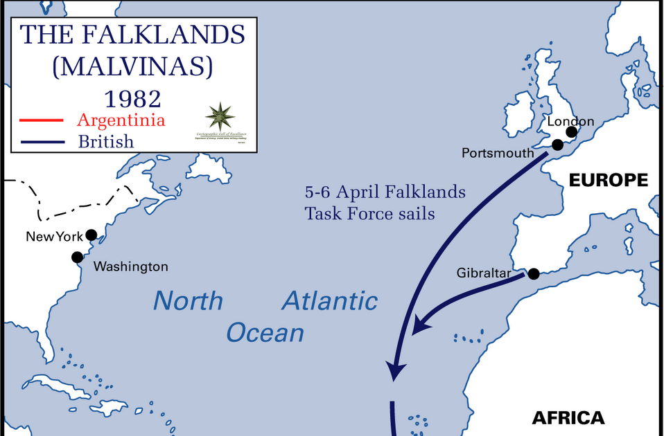 21 мая английские войска высадились на Фолклендах. В операции участвовало двадцать две тысячи солдат, два авианосца, семь эсминцев, семь десантных кораблей, три атомные подводные лодки, сорок истребителей бомбардировщиков вертикального взлёта «Харриер» и 35 вертолётов. Также Министерство обороны Великобритании перебросило на Фолкленды морскую эскадру из сорока кораблей, которая установила блокаду всего архипелага.