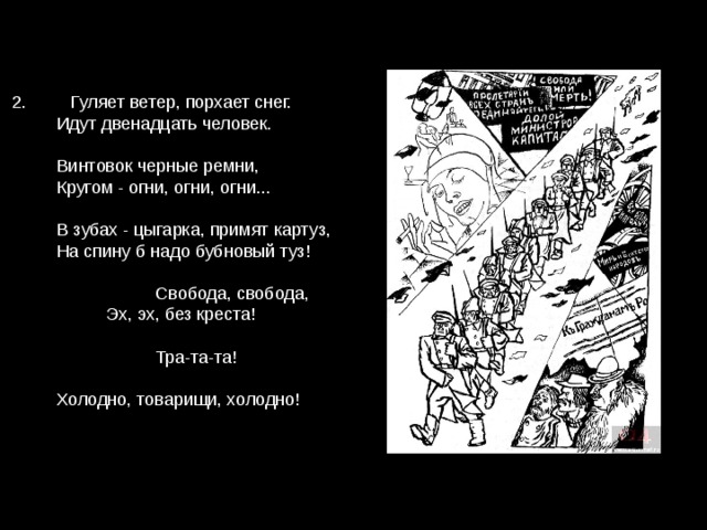 Числовая символика тоже возникла с самого начала. О том, что красногвардейские патрули на самом деле состояли из 12 человек, говорят и документы, и мемуары (в частности, книга Джона Рида). В черновике поэмы есть пометка Блока: «Двенадцать (человек и стихотворений)» .