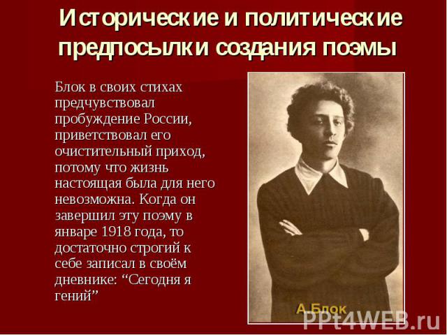 Александр Блок начал писать поэму лишь спустя пару месяцев после Октябрьской революции. К тому времени уже почти год прошёл после кровавых событий февральской революции, которые привели к краху монархии. Поэт писал поэму «в согласии со стихией», он был весь поглощён революционной песней. Произведение нельзя считать революционными стихами, это строки, наполненные жизнью, передающие внутренний мир автора, его чувства, которые он испытывал в те вьюжные дни. Это подтверждают и рекордно сжатые сроки: Блоку потребовался всего лишь месяц, чтобы создать и подкорректировать поэму.