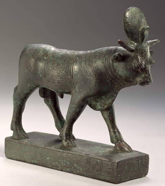 В то же время процветали традиционные египетские культы.Хотя древние египтяне не поклонялись животным, зооморфные изображения олицетворяли качества и характеристики, важные для общества. Бык-самец, в частности, был привлекательным символом, поскольку имел космическую ассоциацию и обычно олицетворял силу и мужскую добродетель, поэтому животное было тесно связано с королевской властью и монархической идеологией.