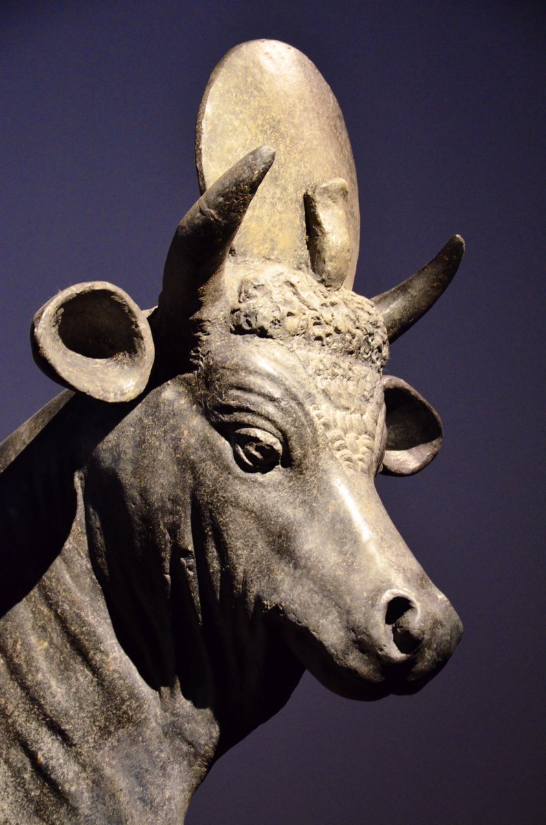 Между гордыми рогами этого быка находятся два символа его божественности — солнечный диск и урейская кобра. Эти атрибуты раскрывают его идентичность как священного быка, возможно, Аписа, но были известны и другие культы быков.Апис был священным богом-быком богов Птаха, Осириса и Атума, а его культовый центр располагался в Мемфисе, столице Египта позднего периода.