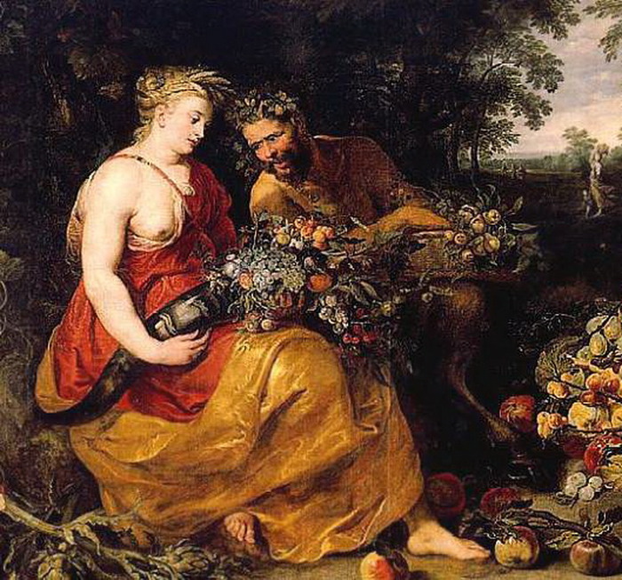 - Символы и атрибуты: колосья пшеницы, корзина со спелыми фруктами, нимб, горящий факел, свинья, маки и рог изобилия.
