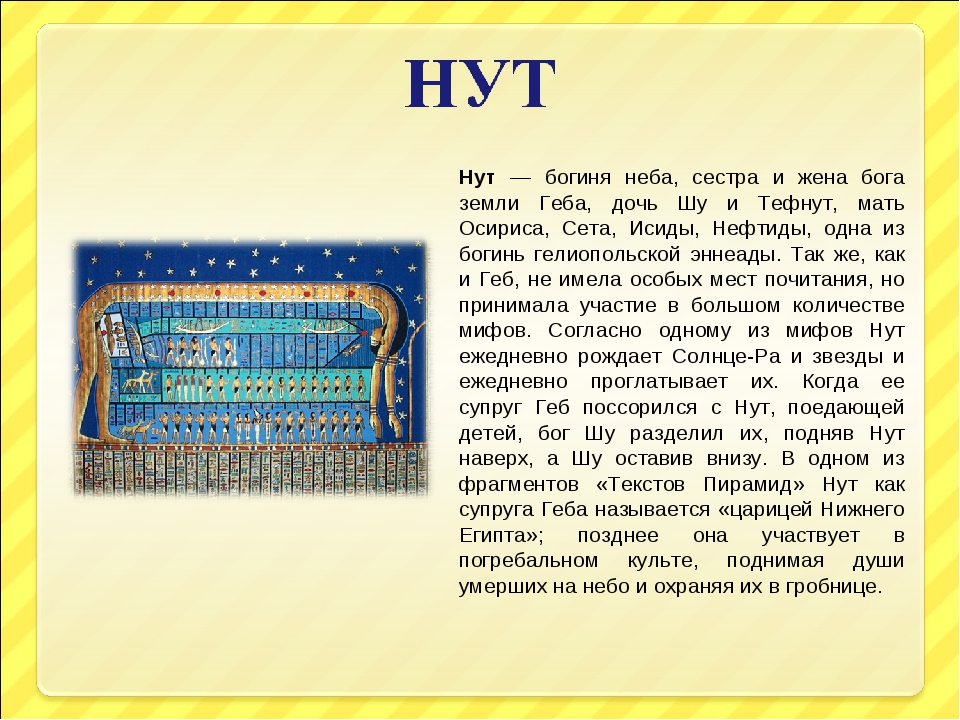 Нут – богиня неба, она олицетворяет собой небосвод, который раскинулся над землей и покрывает землю.