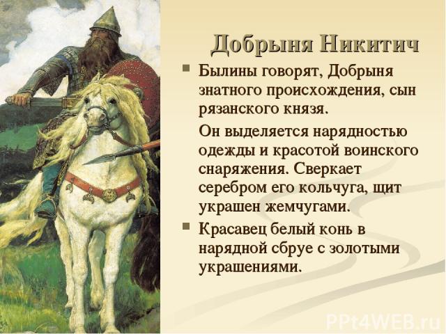 Герой киевских былин. Отважный богатырь, обладавший огромной силой. Мог без труда разорвать сложенную дюжину бычьих шкур. Вырывал шкуру с мясом у несущихся на него разъяренных быков. Прославился тем, что победил змея, освободив от его плена царевну.