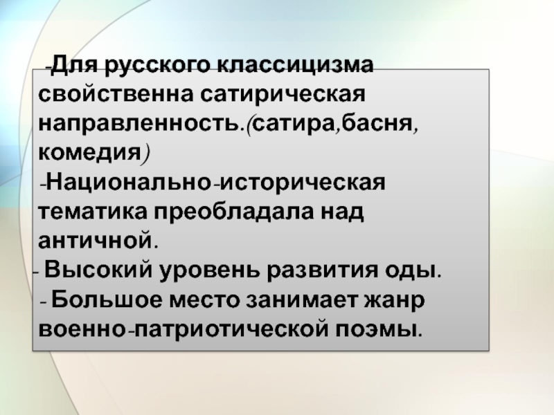 (Выделяется тема просвещенного монарха, роль которого в распространении просвещения в стране, по мнению поэтов-классицистов, очень значительно).![]()