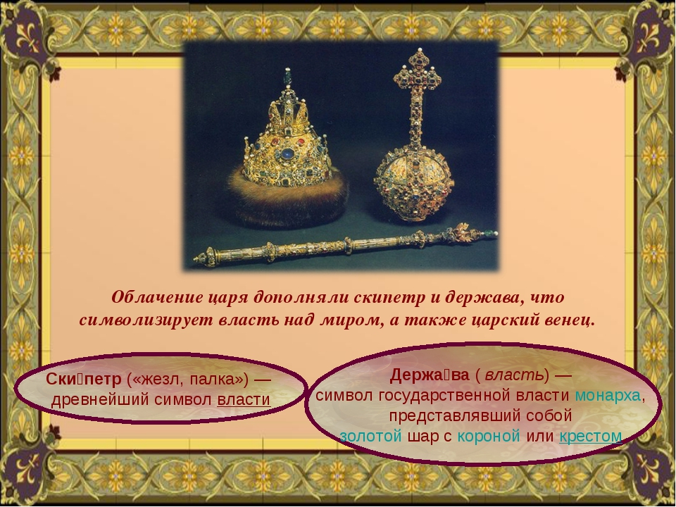 Скипетр — щедро изукрашенный самоцветами и увенчанный символической (как правило, гербовой: геральдической лилией, орлом и т.п.) фигурой жезл, выполненный из драгоценных материалов – серебра, золота или слоновой кости; наряду с короной одна из древнейших инсигний самодержавной власти. В русской истории скипетр явился преемником царского посоха – повседневного, а не парадного символа власти царей и великих князей, некогда принимавших эти регалии от крымских татар в знак их вассальной присяги. В состав царских регалий скипетр «из кости однорога трех футов с половиною длиною, обсаженный дорогими каменьями» (сэр Джером Горсей, Записки о Московии XVI, века) вошел в 1584 году при венчании на царство Федора Иоановича. Эта подаваемая в алтаре храма патриархом Всея Руси в руки Помазанника Божия инсигния власти тогда же вошла в царский титул: «Бога в Троице славимого милостию скипетродержателя Российского царствия».