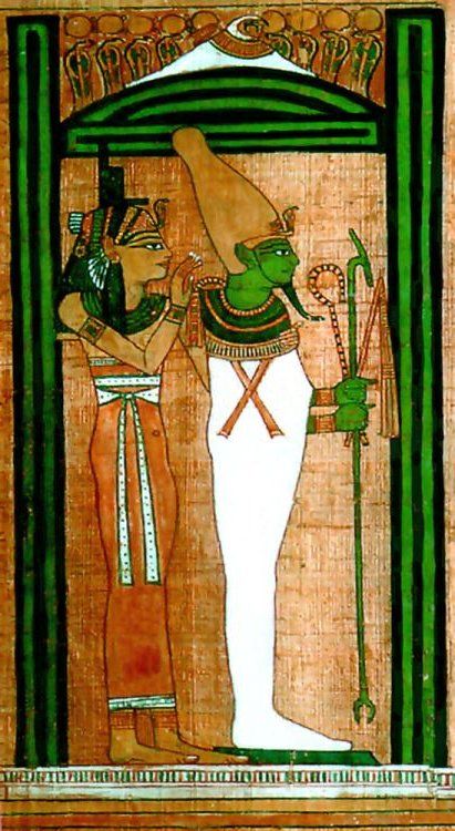 В Древнем Египте Осирис изображался в виде человека, обёрнутого ниже пояса пеленами мумии, с зелёным лицом (чей цвет символизировал свежую растительность), с кнутом и посохом (скипетром) в руках.