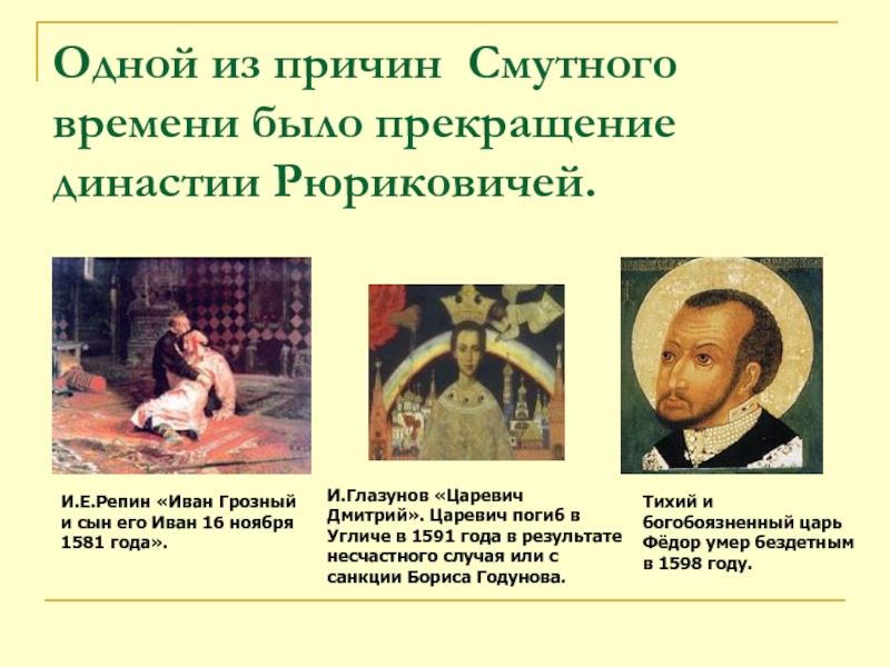 Ко времени смерти в марте 1584 г. царя Ивана Грозного у него осталось всего два сына, последние представители основной ветви династии Рюриковичей.