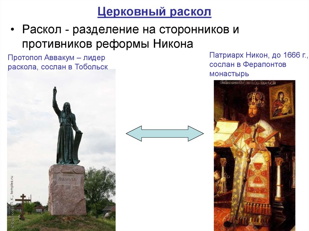 Самым ярым противником Никона был протопоп Аввакум, которого в 1653 г. арестовали и сослали в Сибирь. Началось преследование сторонников Аввакума.