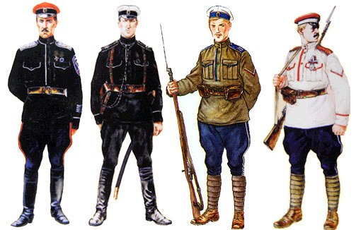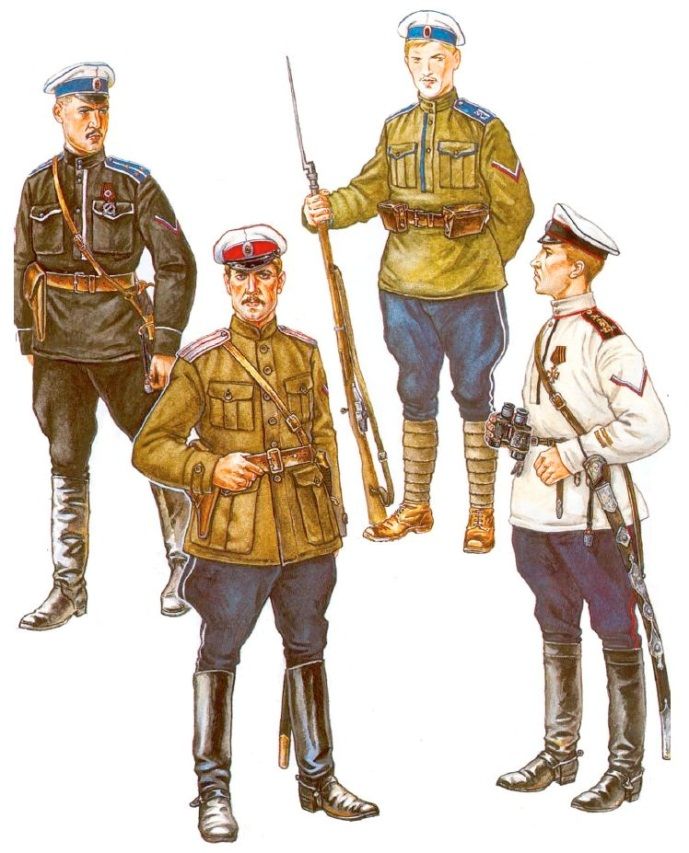 Причем цветные погоны имели право носить лишь испытанные добровольцы, участвовавшие в Кубанских походах. Остальные офицеры, переходившие из Красной армии или присоединявшиеся к армии в занятых местностях, первоначально носили обыкновенные защитные погоны и лишь спустя длительное время удостаивались чести надеть цветные погоны. Да и вообще не было у белых ни эполетов ни шнуров-галунов. И одеты, особенно на первом этапе Гражданской войны, они были бедно – старые шинели и гимнастерки, а то вообще гражданские пальто и пиджаки. Самое главное отличие белых от красных– погоны на плечах.
