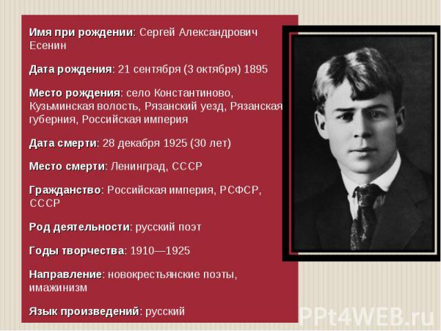 Сергей Есенин рожден в Рязанском селе Константиново 21 сентября 1895 года. Семья не была образованной и богатой. Крестьянский быт многодетной семьи запомнил поэт на всю жизнь. И тёмным пятном в его биографии бедная семья никогда не была. Кроме Серёжи, который был единственным сыном, Есенины — Александр Никитич (1873—1931) и Татьяна Фёдоровна (1875—1955) воспитывали ещё двух дочерей (Екатерину и Александру). Мальчика отдали в земское училище, а потом в церковно-приходскую школу.