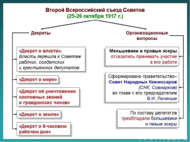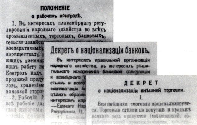 - Декрет о национализации, июнь 1918 г. — при помощи большевистских политкомиссаров, проникших на заводы и в рабочие комитеты — все предприятия с 10 и более рабочими национализированы