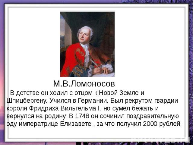 Михайло Васильевич Ломоносов родился в 1711 году возле города Холмогоры, на русском севере. С детских лет мальчик ходил в море вместе с отцом и его всегда интересовали чудеса природы, которые он наблюдал. Михаила занимала смена дня и ночи, тайна полярного сияния и многое другое.
