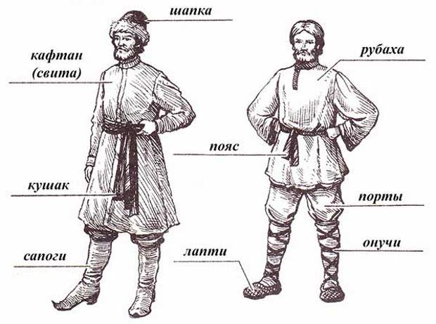 По подолу рубахи настрачивались полоски ткани контрастного цвета, часто из узкой ленты пришивались заранее заготовленные треугольники-зубчики. Иногда низ отстрачивался крупной зигзагообразной машинной строчкой. Порты — штаны из домотканого холста, шили из «тяжовины» — холщевой материи в полоску. Они состояли из трех длин: одна спереди, другая сзади, третья разрезалась по диагонали на клинья для «свободного шага», а к низу зауженные у щиколотки. Знать носила рубаху как нижнее нательное белье. В зависимости от социального статуса ее обладателя рубаха отличалась длиной, орнаментом и качеством материала. Длинные рубахи из шелковых тканей с вышивкой и драгоценными камнями могли себе позволить только князья и вельможи. Богатые носили две пары штанов: холщовые и шерстяные. На плечи набрасывали короткие или длинные плащи, которые застегивались на груди или на одном плече. Зимой простые крестьяне надевали рубахи на меху, овчинный тулуп и рукавицы. Знатные мужчины в качестве верхней одежды использовали кожух – сделанный из кожи животного вывернутой мехом внутрь.