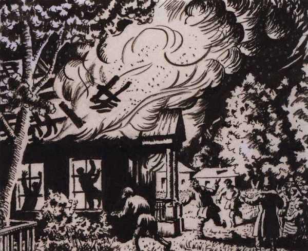 Чиновники напились хозяйского рому и уснули в усадьбе. Ночью Владимир со своими преданными поджег поместье. Против воли хозяина кузнец Архип закрыл на замок двери, чтобы все гости погибли при пожаре.