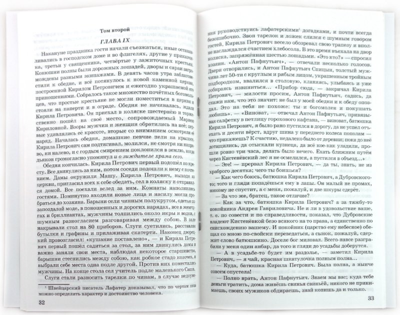 старому другу его законное владение. Глава 5 После похорон отца Владимир застает в кистеневском имении судебных чиновников и заседателя Шабашкина: дом передают Троекурову. Крестьяне отказываются переходить к чужому барину, угрожают чиновникам, наступают на них. Владимир успокаивает крестьян. Чиновники остаются в доме ночевать. Глава 6 Владимир, не желая, чтобы дом, где он провел свое детство, достался Троекурову, распоряжается сжечь его, полагая, что двери не заперты и чиновники успеют выскочить. Кузнец Архип двери запирает (втайне от хозяина) и поджигает усадьбу, успев, впрочем, спасти из огня кошку. Чиновники погибают. Глава 7 Троекуров лично проводит дознание, почему сгорело имение. Выясняется, что виновник пожара — Архип, но и на Владимира падает подозрение. Вскоре в окрестностях появляется шайка разбойников, грабящая помещичьи усадьбы и сжигающая их. Глава 8 История Маши Троекуровой. Маша выросла в уединении, читая романы. У Кириллы Петровича воспитывается Саша, его сын от гувернантки. Для него Троекуров выписывает молодого учителя-француза Дефоржа. Однажды Троекуров ради забавы вталкивает учителя в комнату с медведем. Француз, не растерявшись, стреляет и убивает зверя, чем производит большое впечатление на Машу. Троекуров уважает учителя за храбрость. Француз начинает давать девушке уроки музыки. Вскоре Маша в него влюбляется. Том второй Глава 9 1 октября, в день храмового праздника, к Троекурову съезжаются гости. Антон Пафнутьевич Спицын опаздывает, объясняет, что опасался разбойников Дубровского (именно он показал под присягой, что Дубровские незаконно владеют Кистеневкой). У самого Спицына с собой большая сумма денег, которую он прячет в особом поясе. Исправник божится, что поймает Дубровского, так как у него есть список примет разбойника, впрочем, по замечанию Троекурова, под список этих примет может подойти очень много людей. Глава 10 Спицын просит Дефоржа ночевать с ним в одной комнате, так как он боится ограбления. Ночью Дефорж, оказавшись переодетым Дубровским, отнимает у Спицына деньги и запугивает его, с тем, чтобы Спицын не выдал его Троекурову. Глава 11 Автор возвращается к тому, как Дубровский познакомился с французом Дефоржем на станции, предложил ему 10 тыс. в обмен на документы и рекомендательное письмо к Троекурову. Француз с радостью согласился. В семье Троекурова «учителя» все полюбили: Кирилла Петровича за смелость, Маша «за усердие и внимание», Саша «за снисходительность к шалостям», домочадцы «за доброту и щедрость». Глава 12 Во время урока учитель передает Маше записку с просьбой о свидании в беседке у ручья. Глава 13 В начале следующего лета в имение по соседству с Троекуровым приезжает хозяин — князь Верейский, англоман лет 50. Верейский близко сходится с Кириллой Петровичем и Машей, ухаживает за девушкой, восхищается ее красотой. Глава 14 Верейский делает предложение. Троекуров его принимает и приказывает дочери выходить за старика. Маша получает письмо от Дубровского с просьбой о свидании. Глава 15 Маша встречается с Дубровским, который уже знает о предложении князя. Предлагает «избавить Машу от ненавистного человека». Та просит пока не вмешиваться, надеется сама переубедить отца. Глава 16 Маша пишет письмо Верейскому с просьбой отступиться, но тот показывает письмо Троекурову, и они решают ускорить с