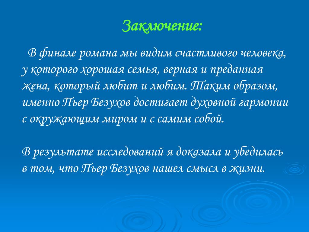 В финале романа мы видим любимого героя Л. Н. Толстого примерным семьянином, увлечённым человеком, нашедшим себя. Он занимается общественной деятельностью, встречается с интересными людьми. Его ум, порядочность, честность и доброта теперь востребованы и полезны обществу. Любимая и преданная жена, здоровые дети, близкие друзья, интересная работа – составляющие счастливой и наполненной смыслом жизни Пьера Безухова. В сочинении на тему «Путь исканий Пьера Безухова» дан подробный анализ нравственных и духовных поисков честного и благородного человека, который путём проб и ошибок находит свой смысл существования. Герой, наконец, достиг «успокоения, согласия с самим собой».